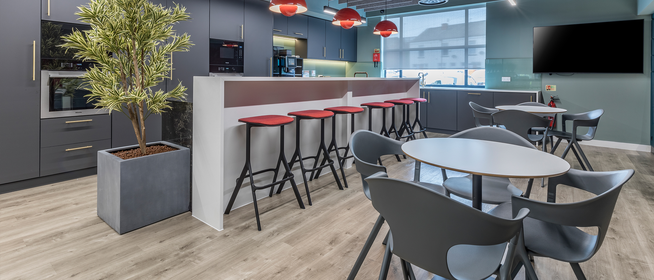 Staff facilities include a fully equipped gym and a bright, homely kitchen and breakout space.